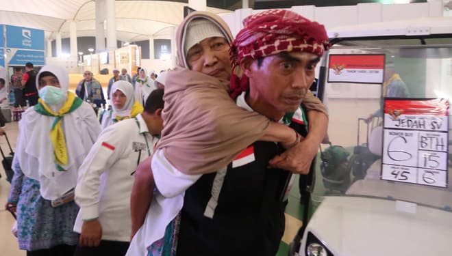 TIMES Merauke/Petugas PPIH menggendong jemaah risti di bandara KAIA Jeddah, jelang pulang ke tanah air. (FOTO : istimewa).